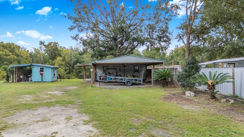 Enjoy riverfront living on this high and dry, mostly X flood zone 1 / 2 acre property, featuring 150 feet of waterfrontage and walking distance to the community boat launch. This beautifully updated home welcomes you with new plumbing, subfloor, LVP flooring, fresh paint, and custom trim work throughout. The spacious living room offers a cozy wood-burning fireplace and a built-in desk, offering both comfort and functionality. A formal dining area separates the living space from the kitchen, which boasts new countertops, a stylish backsplash, and a breakfast bar that opens the room for easy entertaining. The master suite is a dream come true, featuring double closets, dual vanities with a dressing area, a soaking tub, and a standalone shower. Additional bedrooms and closets are generously sized and conveniently located near the second bath. Step outside to the rear deck—complete with a covered grilling area and screened section perfect for enjoying the outdoors. Utilize the concrete steps to fish from the riverbank. The fenced backyard includes an electric double gate, storage building, double carport and a workshop complete with window-unit A/C. Fruit lovers will appreciate the mature blueberry and orange trees, offering a sweet touch of homegrown goodness as you relax and take in the serene river views. Located in the safe and desirable Lands Landing neighborhood, just a short drive to the shimmering sands of Mexico Beach, and shopping, dining and more in Panama City and Port St Joe. Schedule your showing now!