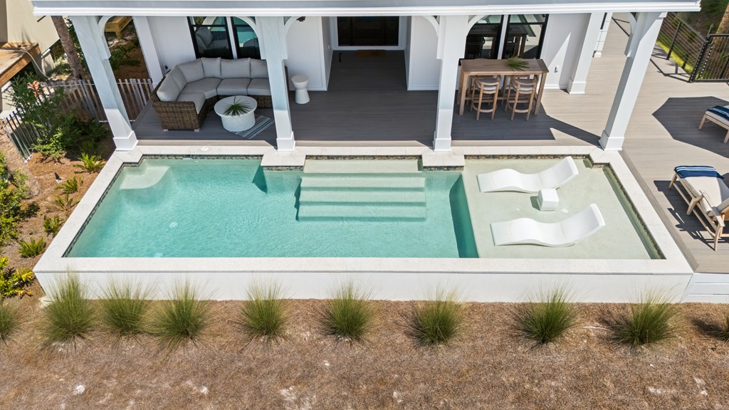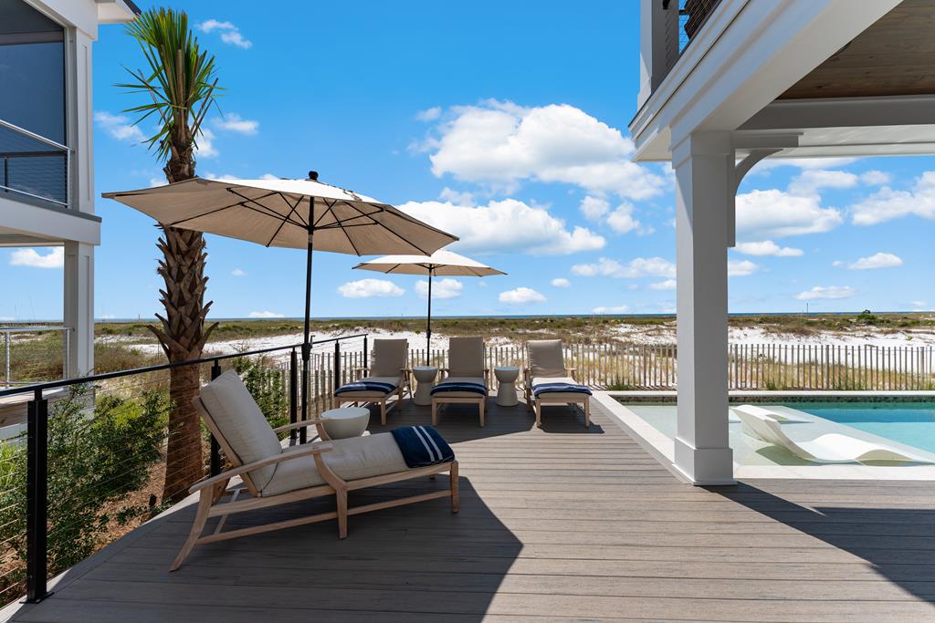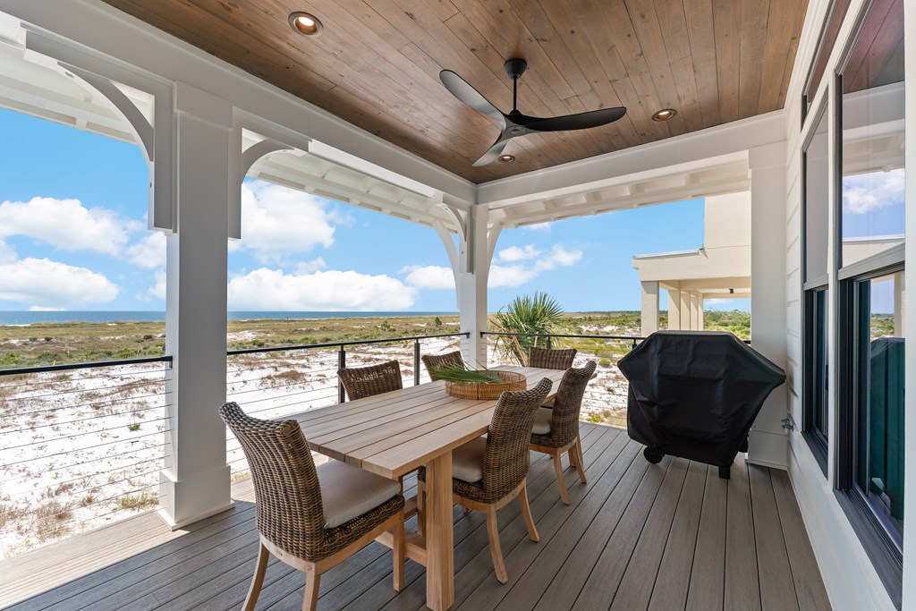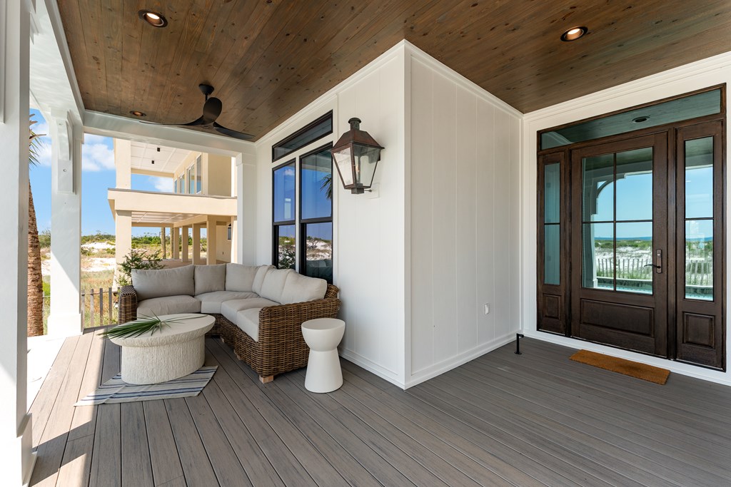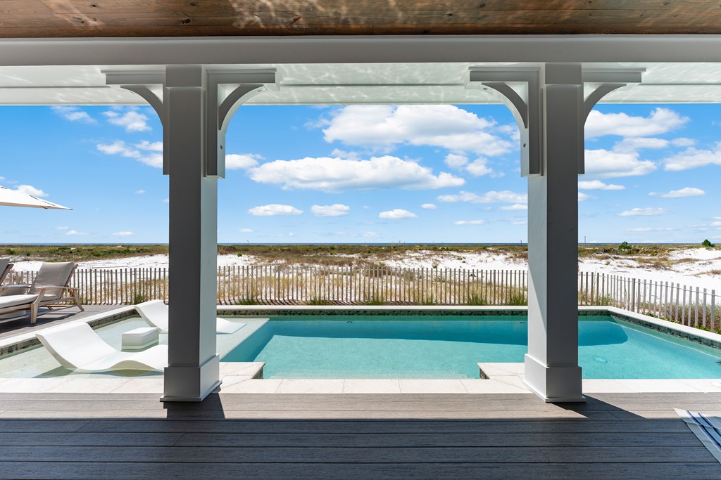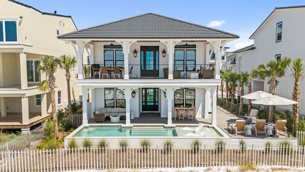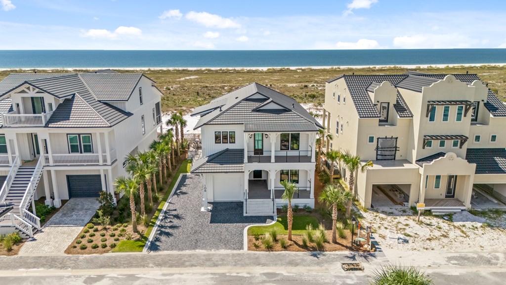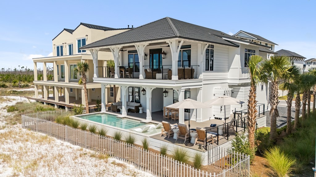 Refined living for the most discerning buyer. Details abound in this newly built, custom-designed Gulf front home nestled in the exclusive Sugar Sands subdivision, a pristine beachfront community in Mexico Beach. From the warm wood accents on ceilings and walls to the hand-selected pecky cypress doors, every element reflects superior craftsmanship and thoughtful design. The home offers four spacious bedrooms, each with its own en suite bath, along with two additional half baths, dual laundry rooms, and an outdoor shower—balancing comfort with convenience. Expansive porches and decks invite you to enjoy sweeping Gulf views, while the heated saltwater pool provides a serene retreat. Inside, the primary suite showcases a tray ceiling crafted from whitewashed pecky cypress—a stunning architectural statement. The open-concept living, dining, and kitchen space on the second floor is framed by walls of windows, ensuring every sunset is unforgettable. A chef's kitchen with premium appliances, a second ice maker, and a generous island completes the heart of the home. Equally suited as a private retreat or a high-performing investment, this coastal modern masterpiece embodies relaxed luxury, where quality, privacy, and natural beauty come together seamlessly.
