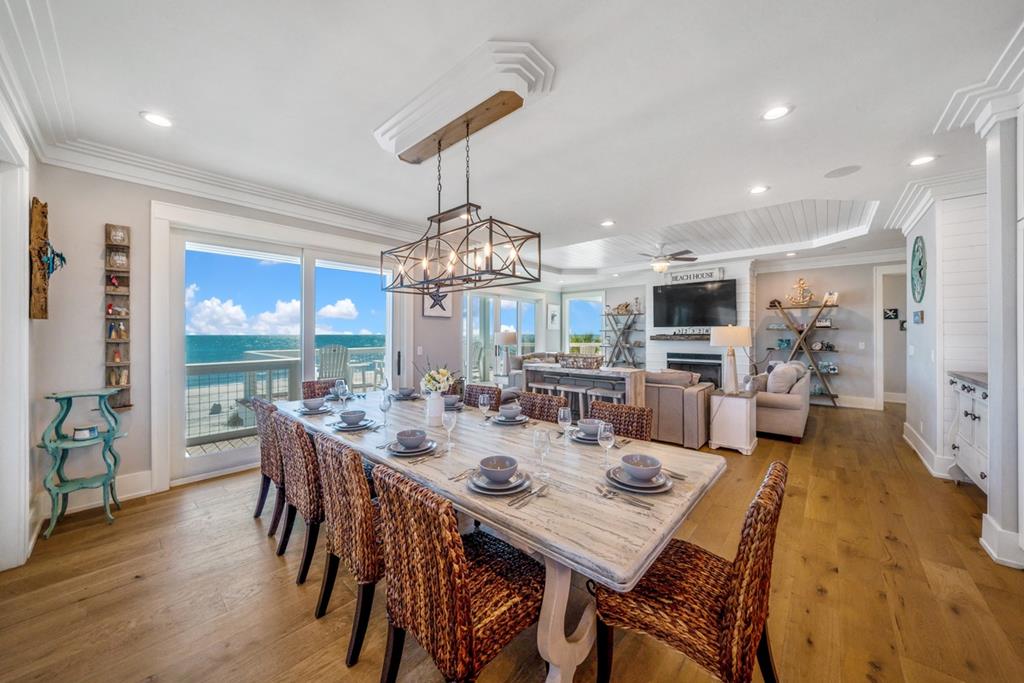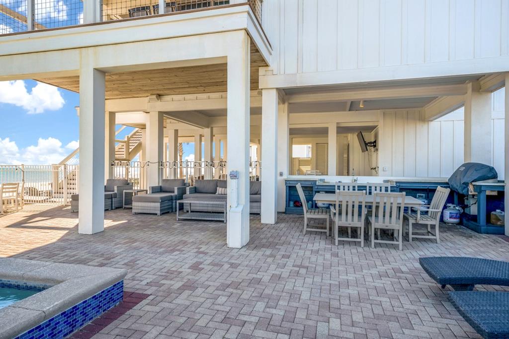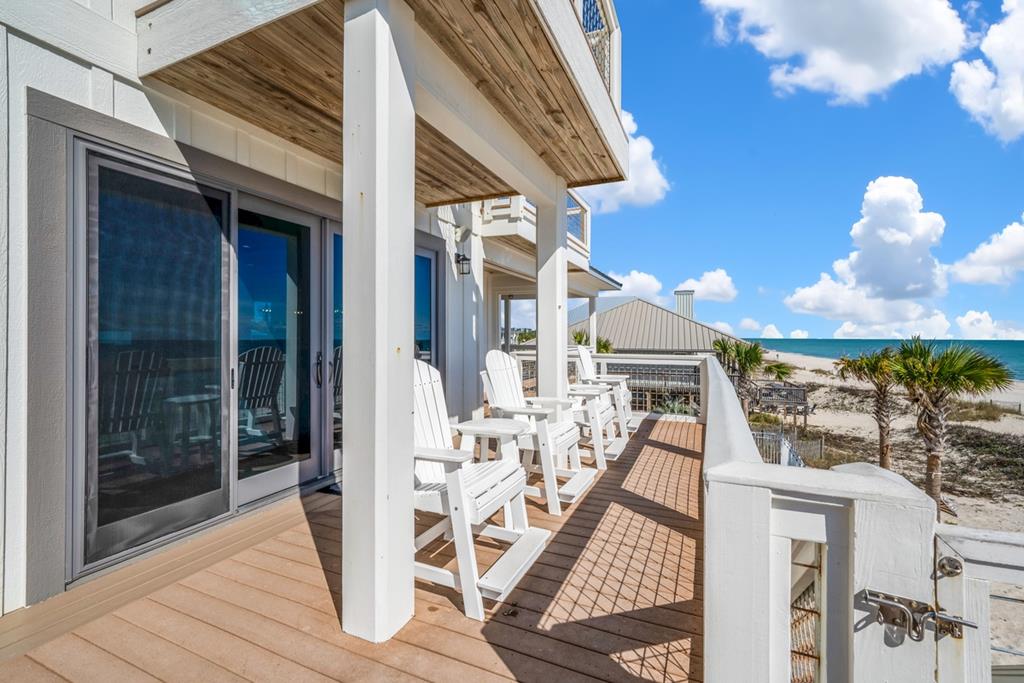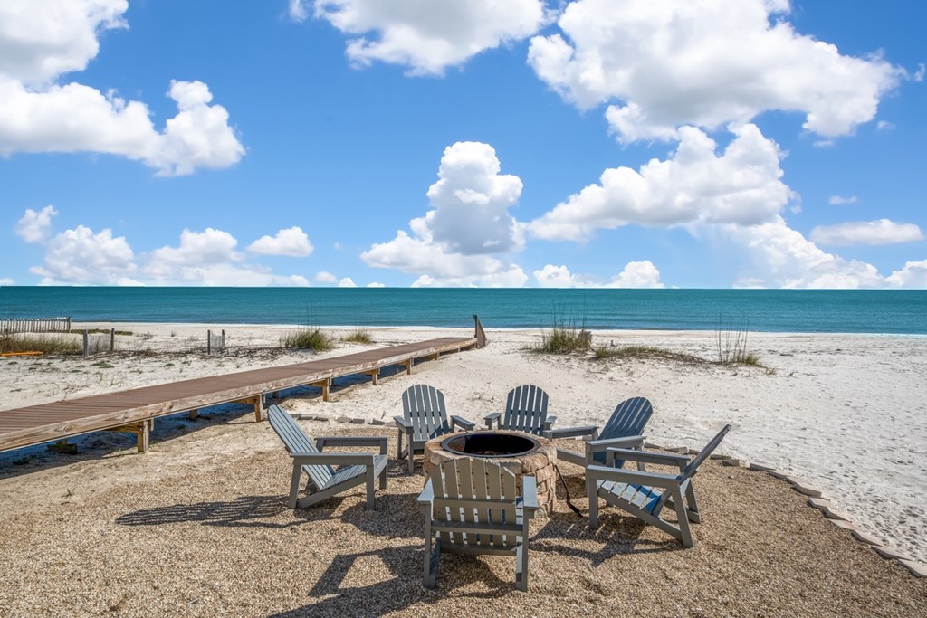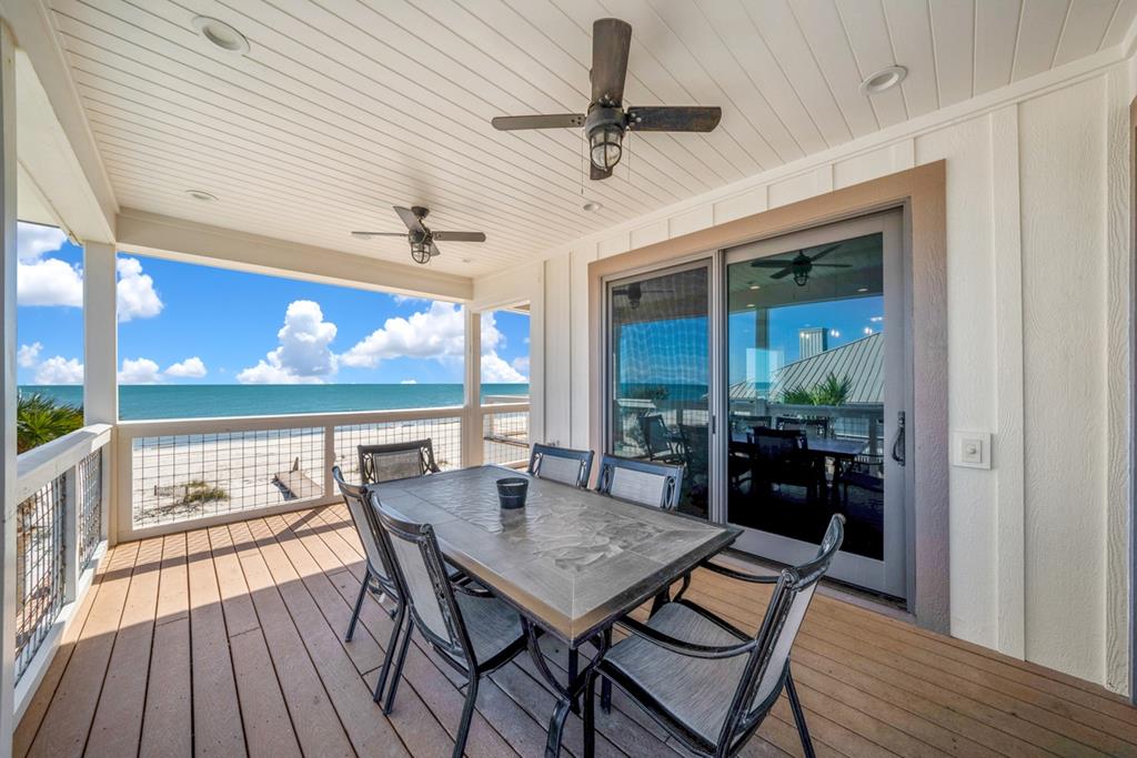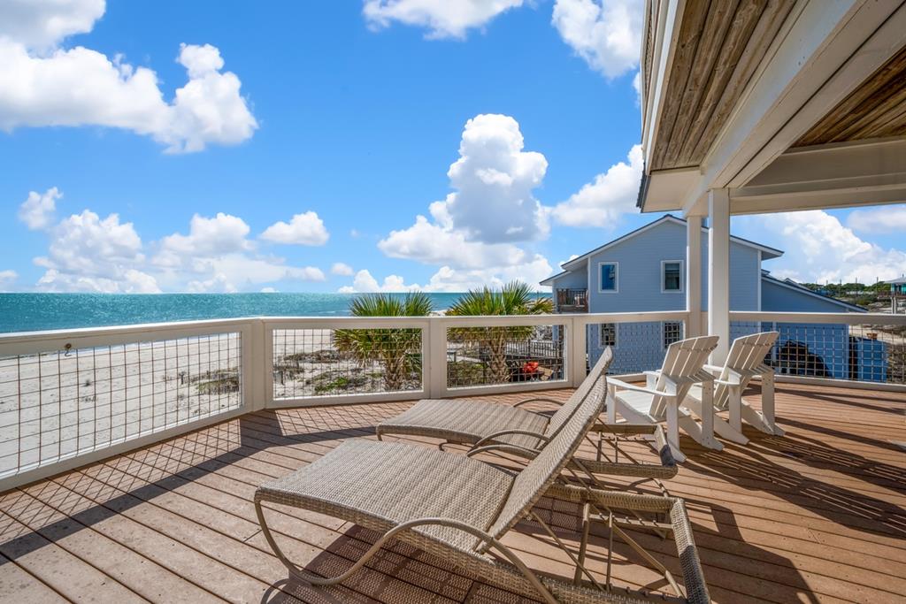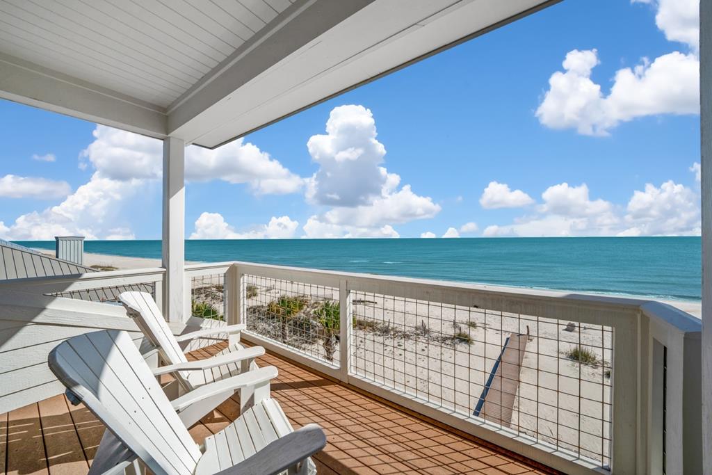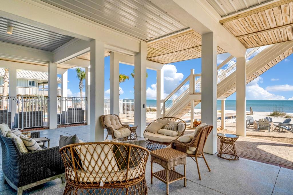 "Solitude" Exquisite Gulf Front home nestled on St George Island's acclaimed East End with 100' frontage on Gulf of Mexico white sand beach. This architectural beauty, built by renowned William Solburg and completely renovated in 2021, epitomizes timeless elegance and modern convenience. Experience private resort living with the heated salt water pool/spa, fire pit, outdoor kitchen, al fresco' dining, brick paved patio, and multiple gathering areas overlooking blue ocean water and uncrowded white sand beach. This elegant home was custom designed to capture morning sunrise and the glow of evening sunset over the Gulf of Mexico. The inherent warmth of the tastefully appointed open gathering/dining area is amplified by a gas fireplace and light streaming from wrap-around window walls and doors leading to the expansive waterfront deck. A spacious 2nd floor game/media room with Gulf side deck adds fun for all ages with arcade games, foosball, and large-screen TV. The open kitchen presents a picturesque place to prepare and share meals. A true Chef's delight equipped with center island prep-breakfast bar, quartz countertops, generous bright white cabinetry, 2 dishwashers, double ovens and refigerators, icemaker, a large Butler's pantry and a premium gas range with custom exhaust hood. Comfortable sleeping accomodations abound for family and guests with 8 bedrooms, 7 baths and 2 powder rooms. 6 bedrooms open to decks or private balconies to embrace the serenity of lapping waves and starlit skies. Solid construction with LVP flooring, Hardi type siding and underpinning, weather guard stairs/decking, and standing seam metal roof. "Solitude" is a popular vacation rental offered turnkey furnished.