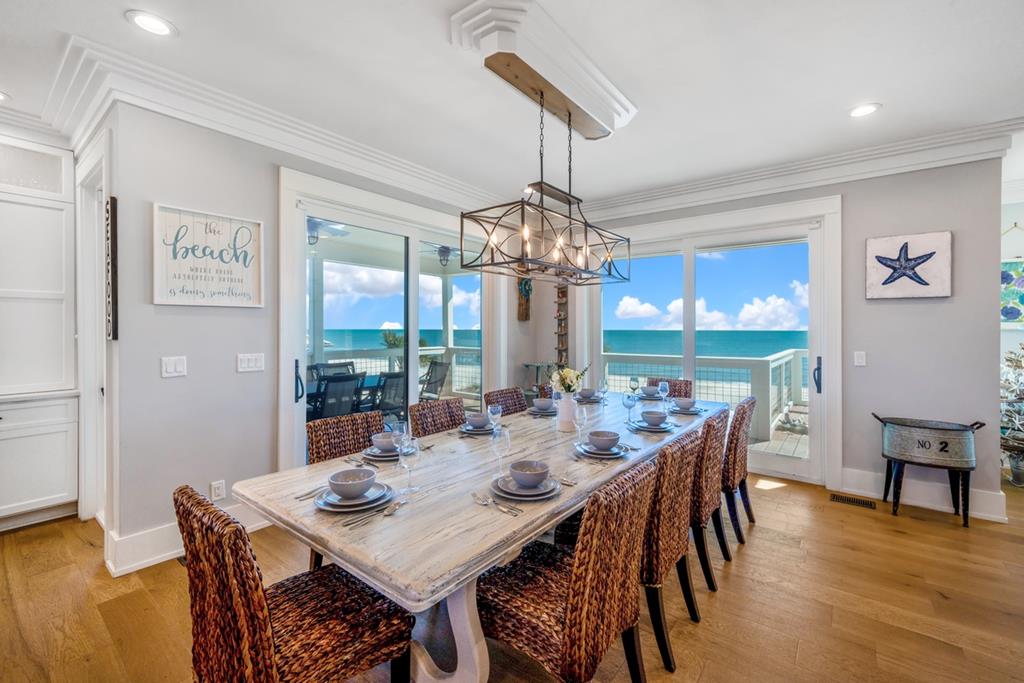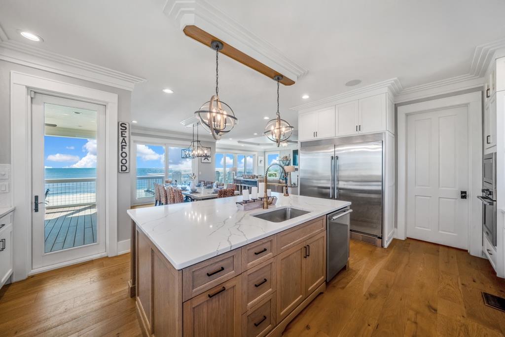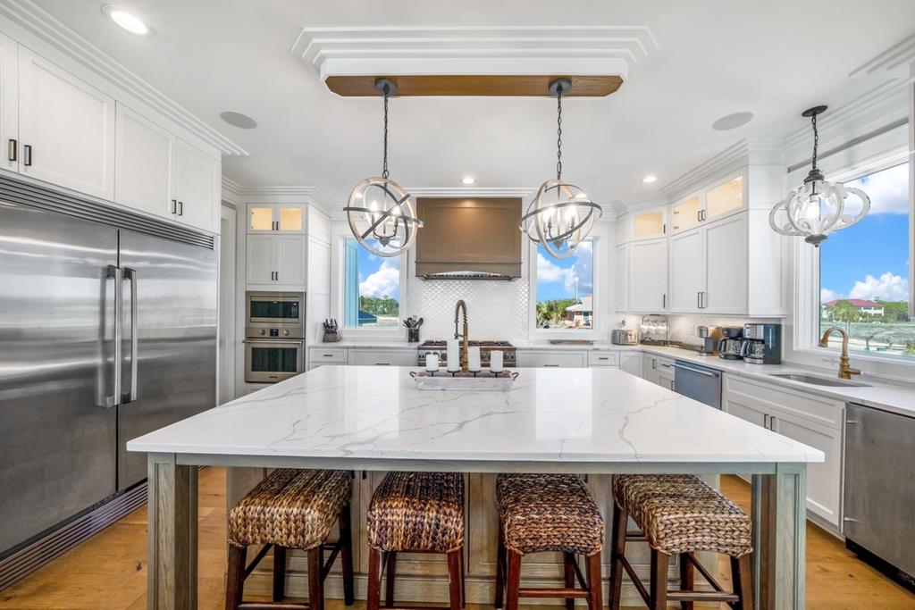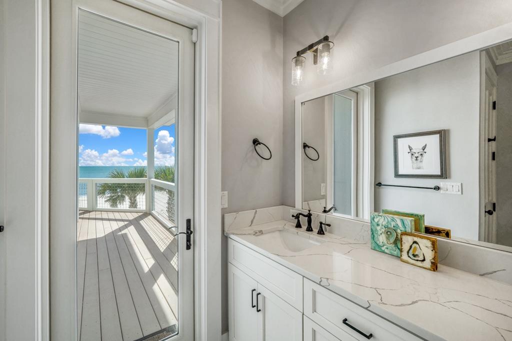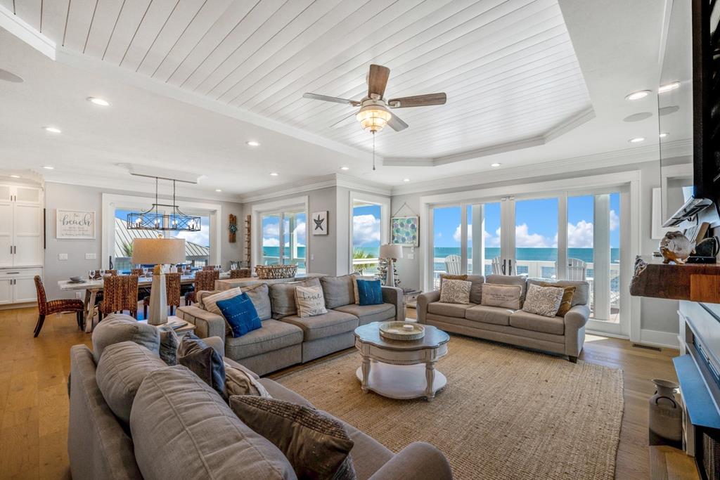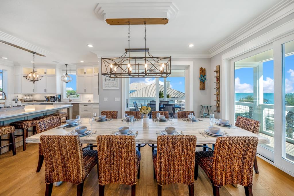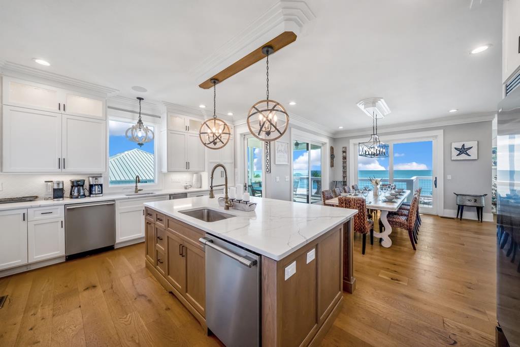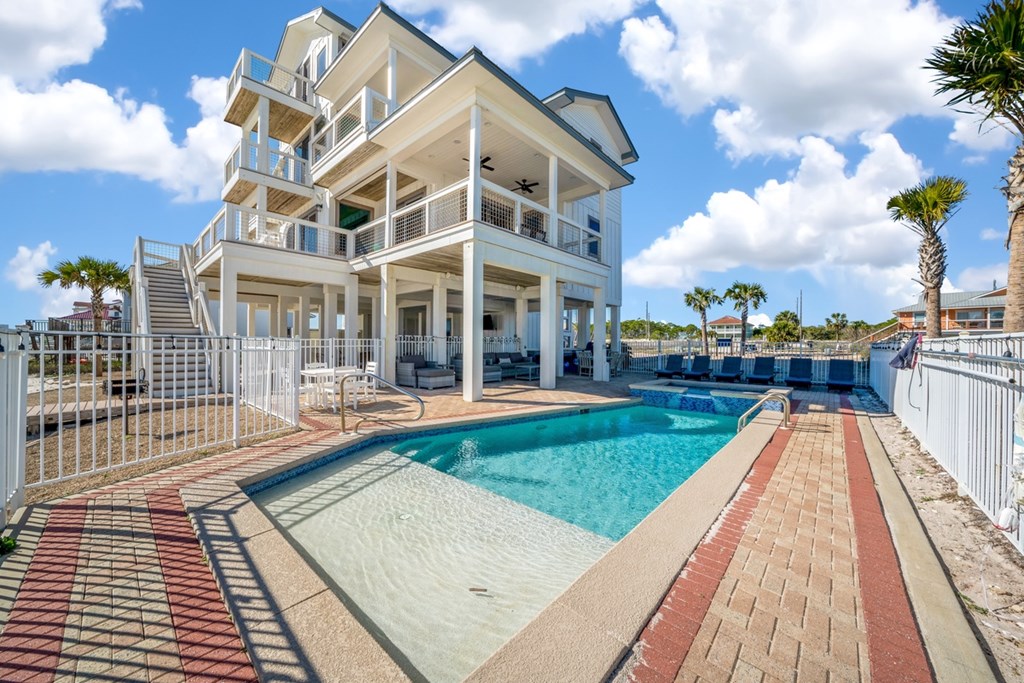 "Solitude" Exquisite Gulf Front home nestled on St George Island's acclaimed East End with 100' frontage on Gulf of Mexico white sand beach. This architectural beauty, built by renowned William Solburg and completely renovated in 2021, epitomizes timeless elegance and modern convenience. Experience private resort living with the heated salt water pool/spa, fire pit, outdoor kitchen, al fresco' dining, brick paved patio, and multiple gathering areas overlooking blue ocean water and uncrowded white sand beach. This elegant home was custom designed to capture morning sunrise and the glow of evening sunset over the Gulf of Mexico. The inherent warmth of the tastefully appointed open gathering/dining area is amplified by a gas fireplace and light streaming from wrap-around window walls and doors leading to the expansive waterfront deck. A spacious 2nd floor game/media room with Gulf side deck adds fun for all ages with arcade games, foosball, and large-screen TV. The open kitchen presents a picturesque place to prepare and share meals. A true Chef's delight equipped with center island prep-breakfast bar, quartz countertops, generous bright white cabinetry, 2 dishwashers, double ovens and refigerators, icemaker, a large Butler's pantry and a premium gas range with custom exhaust hood. Comfortable sleeping accomodations abound for family and guests with 8 bedrooms, 7 baths and 2 powder rooms. 6 bedrooms open to decks or private balconies to embrace the serenity of lapping waves and starlit skies. Solid construction with LVP flooring, Hardi type siding and underpinning, weather guard stairs/decking, and standing seam metal roof. "Solitude" is a popular vacation rental offered turnkey furnished.